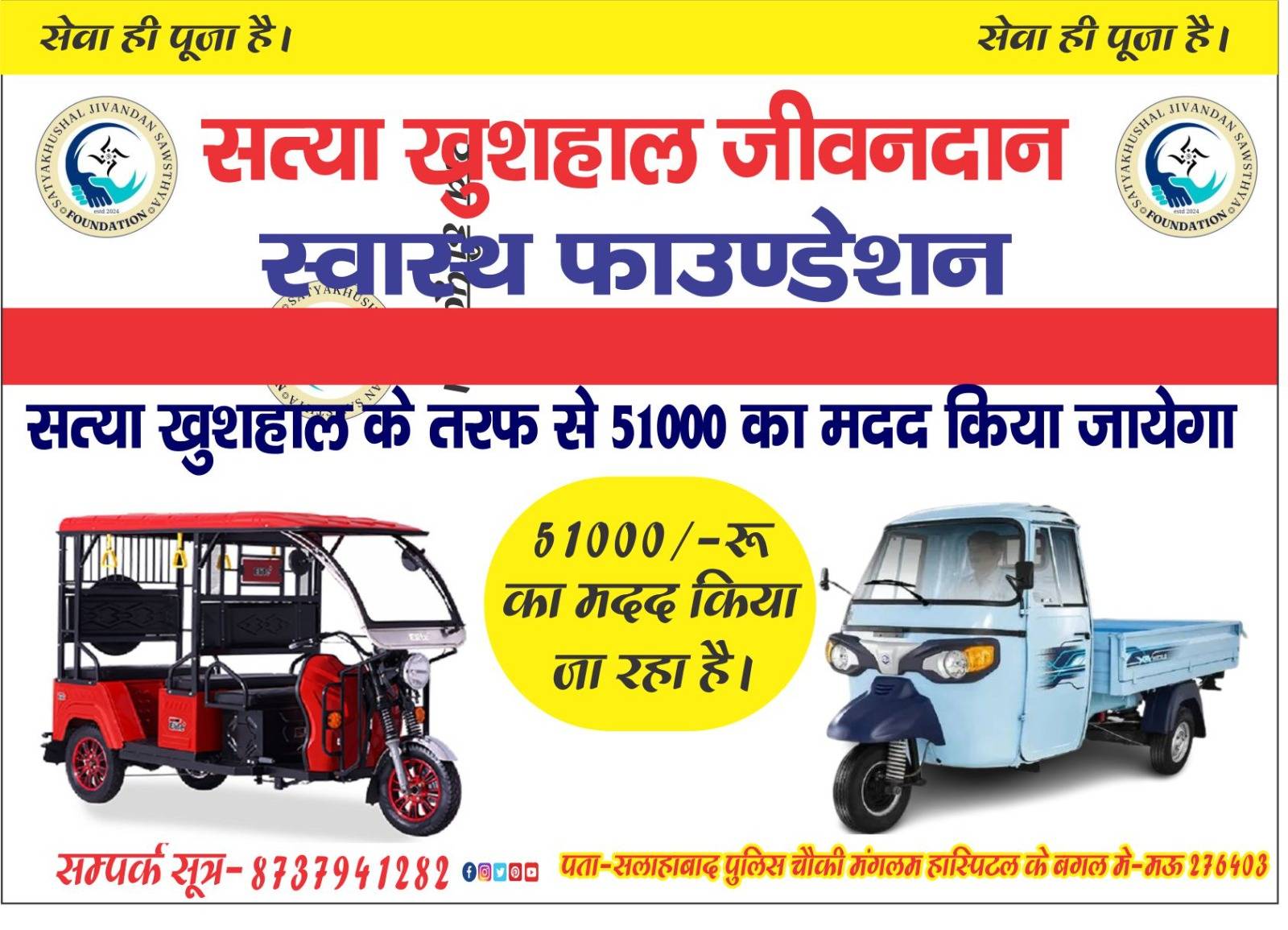 Help needy families with ₹51,000 assistance for e-rickshaws and vehicles to build sustainable income sources.